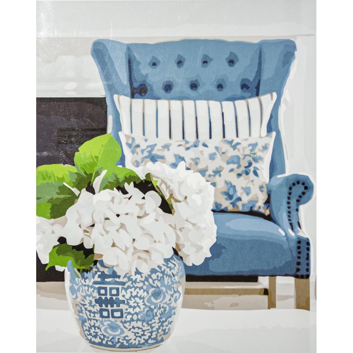 Картина по номерам Strateg ПРЕМИУМ Гортензия у кресла с лаком размером 40х50 см VA-3368