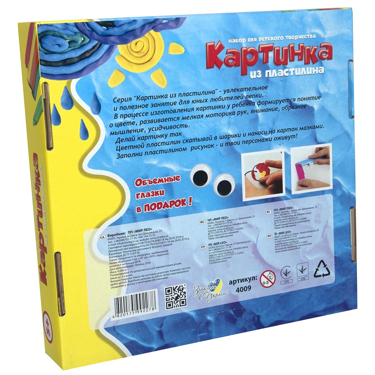 \nНабір включає пластилін декількох кольорів, спеціальну еко-рамку для майбутнього шедевра та малюнок з контурами. За допомогою цих предметів можна легко відчути себе художником та створити яскраве зображення. Процес досить простий - необхідно відокремлювати маленькі шматочки пластиліну, скочувати в кульки. Потім акуратно приклеювати в потрібне місце, злегка розплющуючи пальцем.