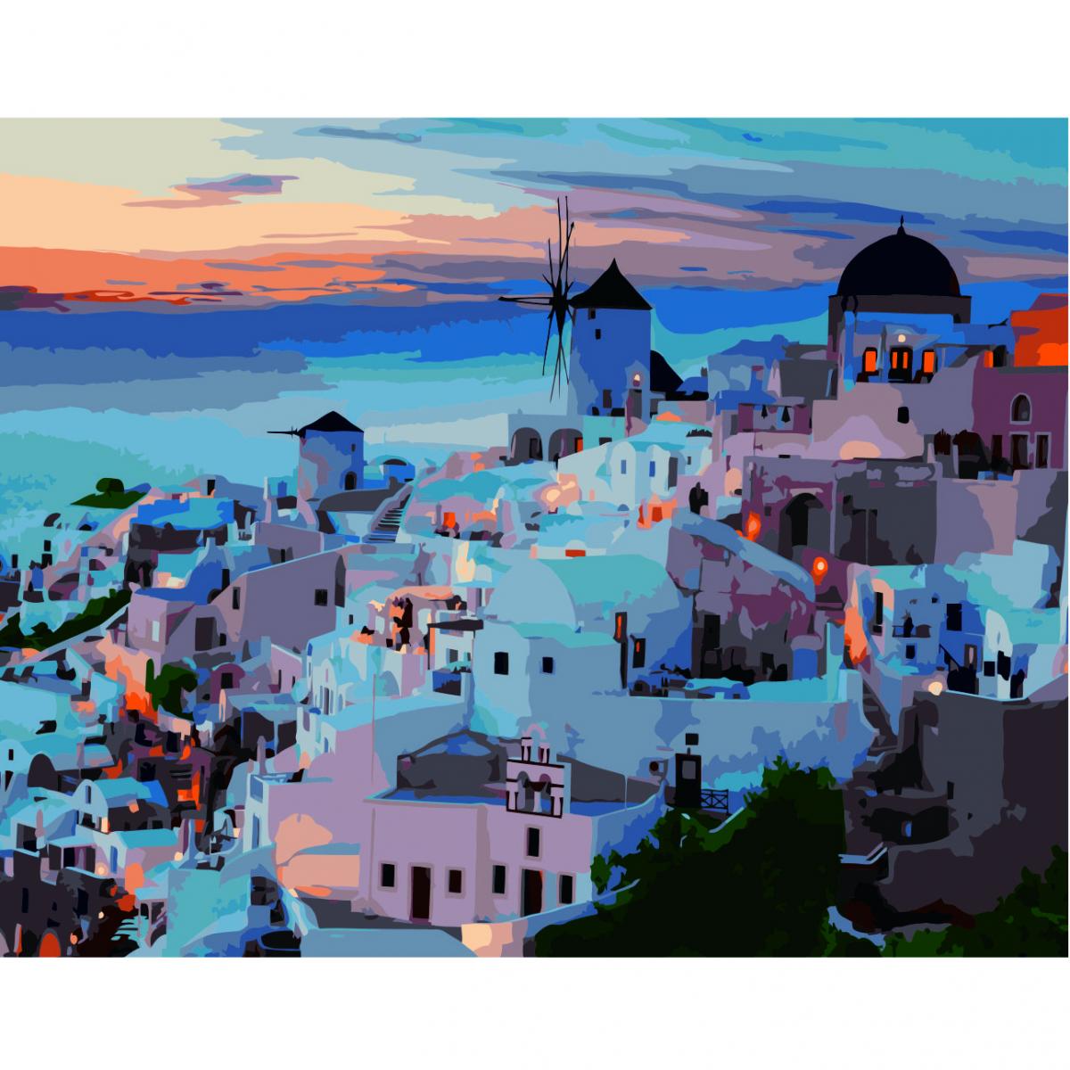 Картина за номерами Strateg ПРЕМІУМ Вечірній Санторіні з лаком розміром 40х50 см VA-2740