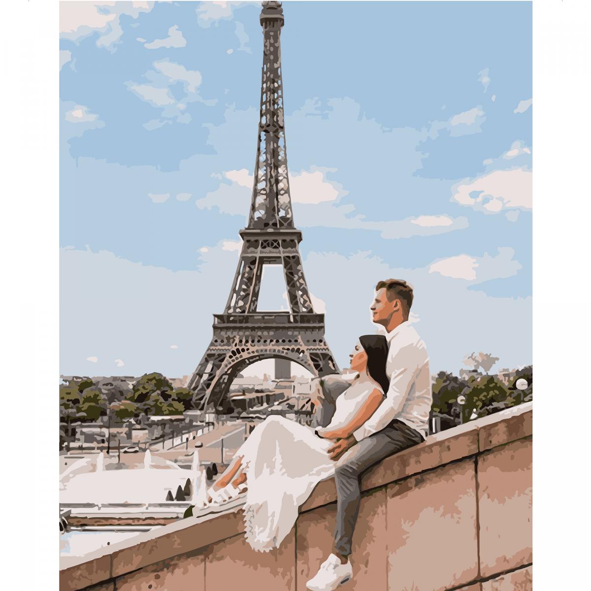 Картина за номерами Strateg ПРЕМІУМ Strateg Закохані біля Ейфелевої вежі з лаком розміром 40х50 см VA-1559<\/p>\n