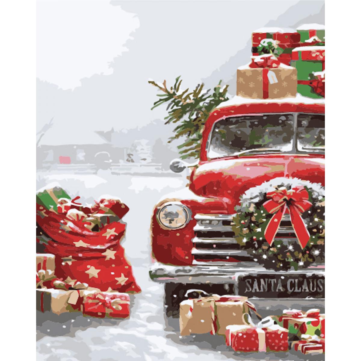 Картина за номерами Strateg ПРЕМІУМ Машина з подарунками з лаком та з рівнем розміром 40х50 см (GS1570)<\/p>