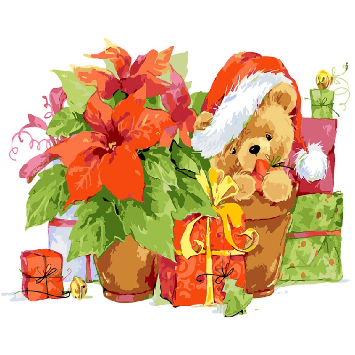Картина за номерами Strateg ПРЕМІУМ Медведик з подарунками з лаком та з рівнем розміром 40х50 см (GS1571)<\/p>