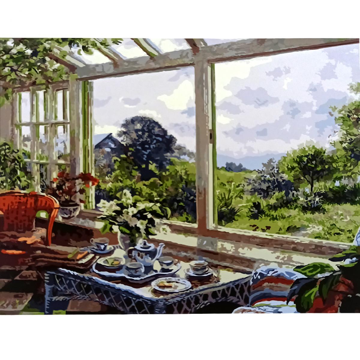 Картина за номерами Strateg ПРЕМІУМ Сніданок на веранді з лаком розміром 40х50 см (SY6606)<\/p>\n