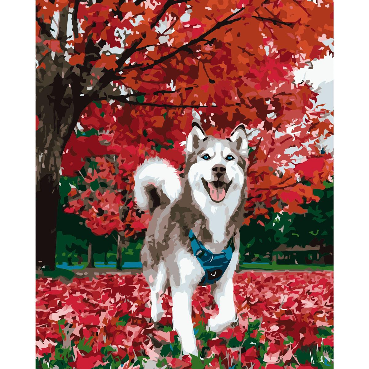 Картина по номерам Strateg ПРЕМИУМ Хаски осенью с лаком размером 40х50 см VA-1147<\/p>\n