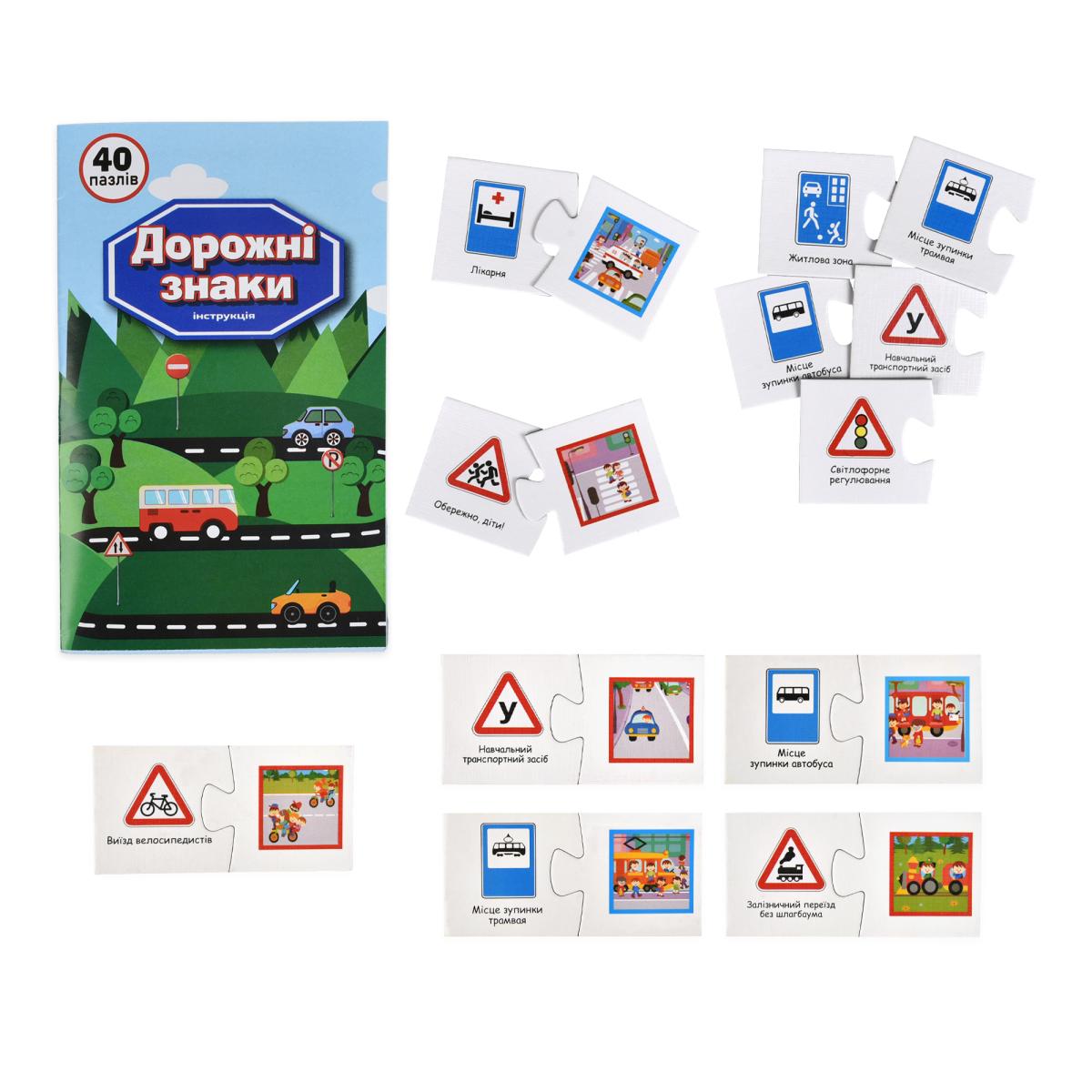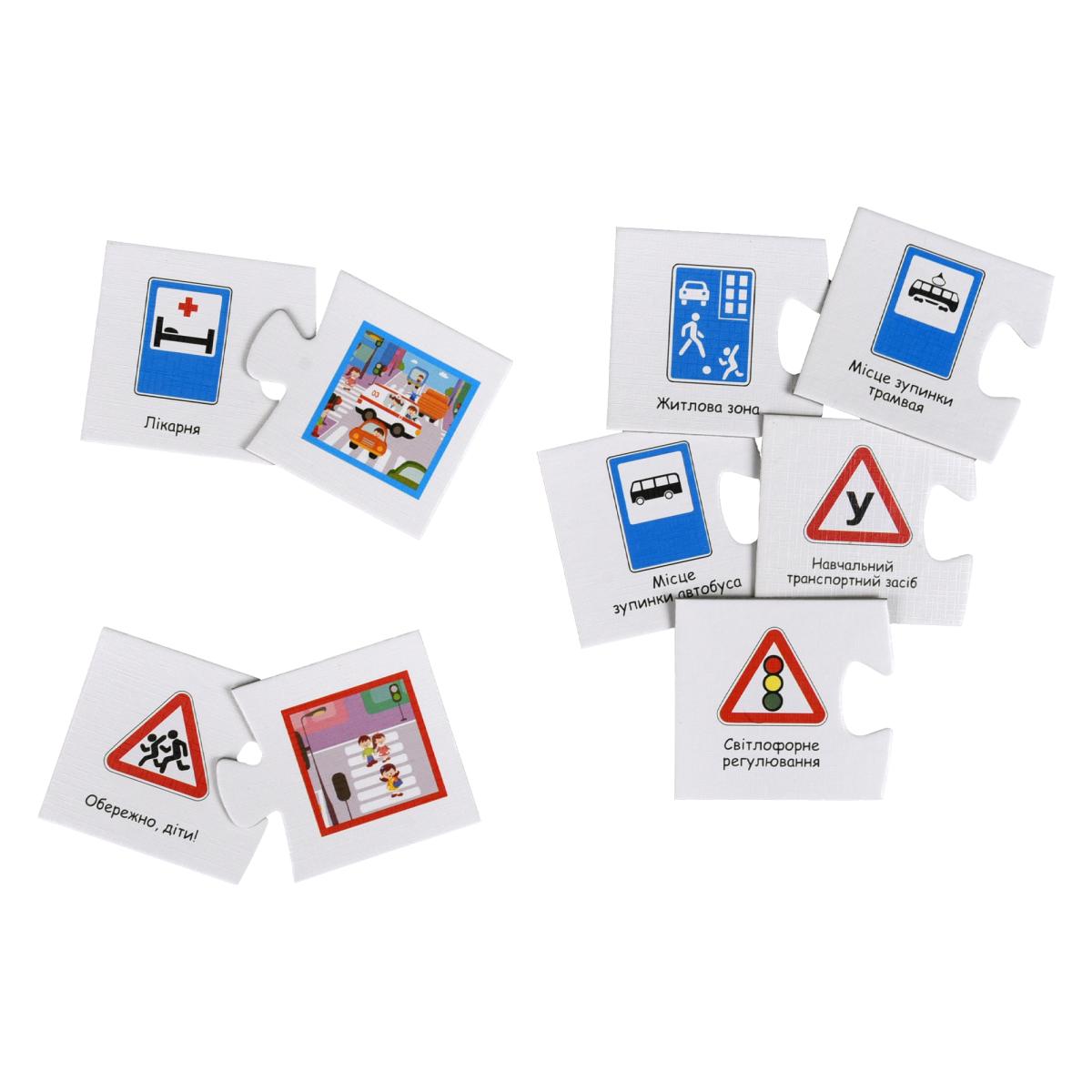 «Дорожные знаки» — набор парных пазлов для детей от 3 лет, что в доступной и игровой форме знакомит их с основными дорожными знаками, средствами регулирования движения и обозначениями транспортных средств.