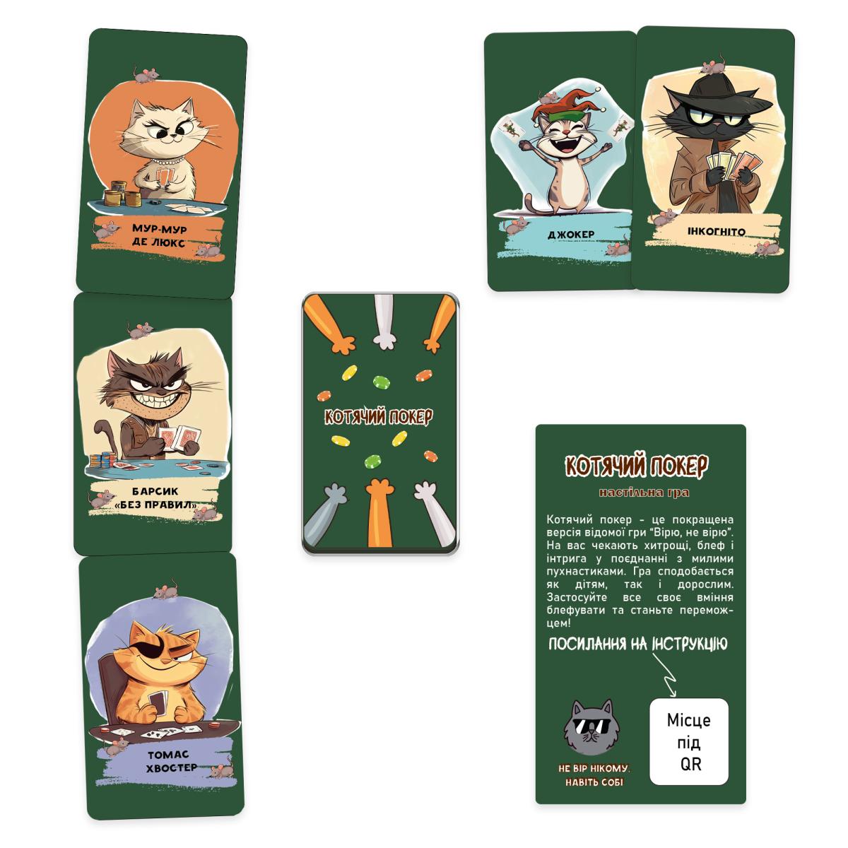 «Кошачий покер» — это улучшенная версия известной игры «Верю — не верю». Простая, веселая настольная игра, где уловки блеф и интрига сочетаются с милыми пушистиками.